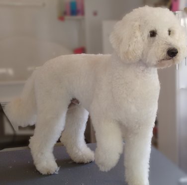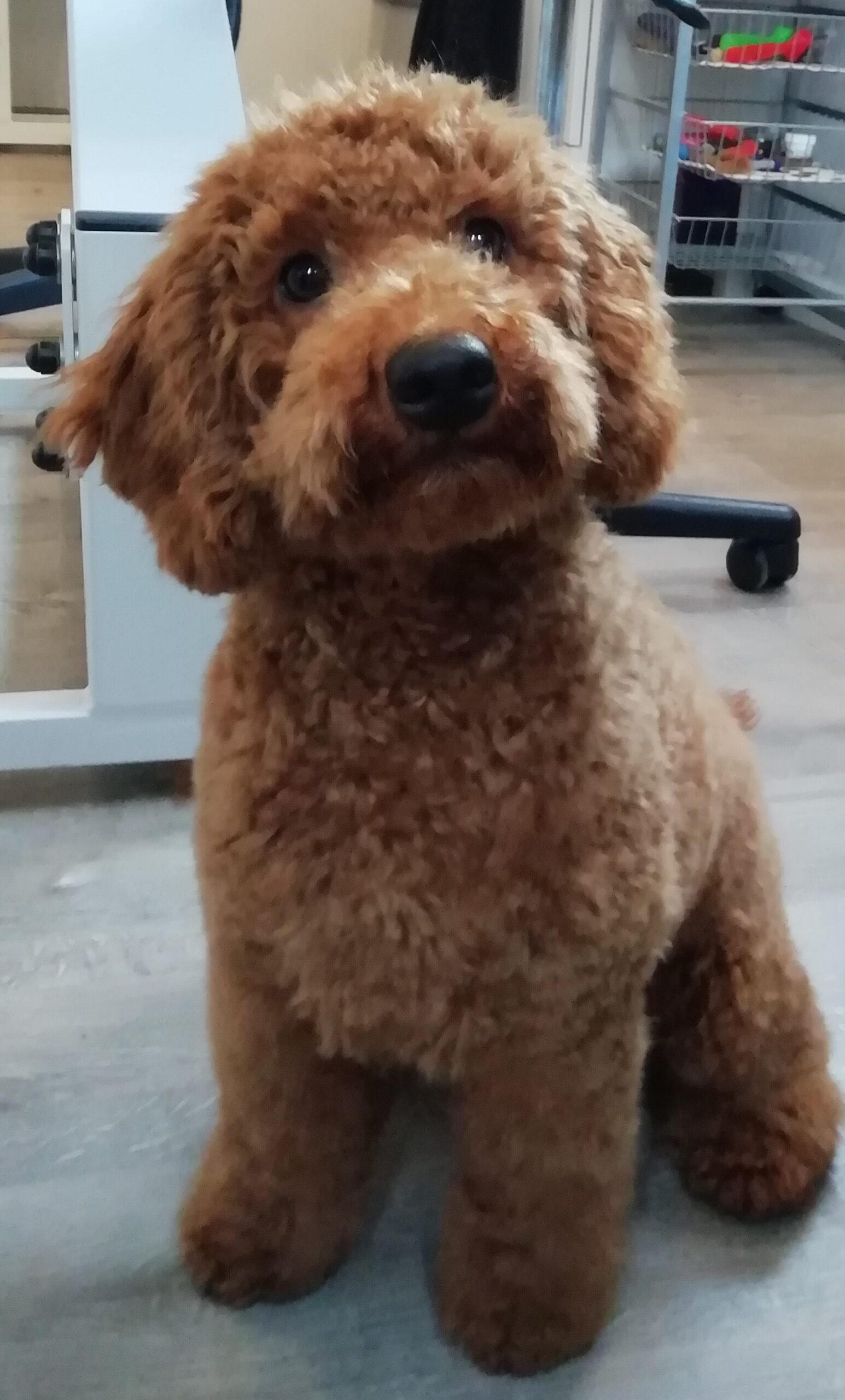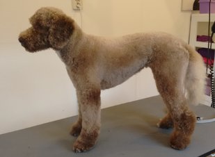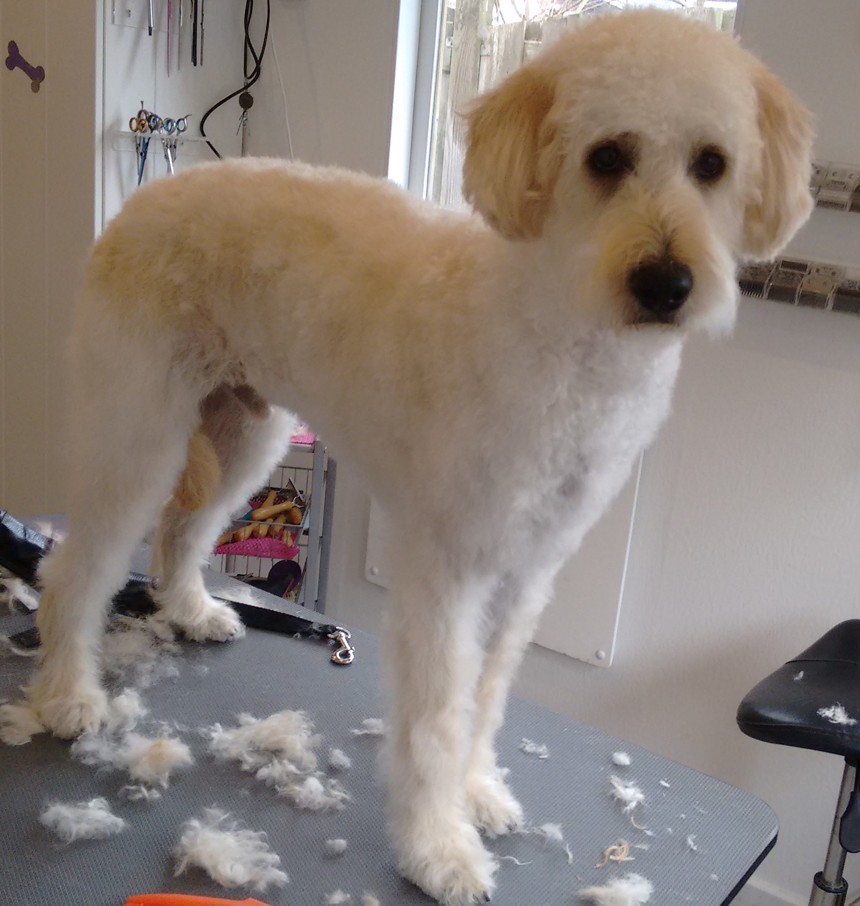 Lang genoeg voor een fluffy uiterlijk, maar ze heeft geen haren voor haar ogen | Dit is het meest voorkomende model. Het lijf wordt kort geschoren op ca 13 mm en de poten voller laten. | Soms heeft een doodle weinig haar op de poten. Kunst om er dan toch nog iets moois van te maken. Doe het lijf niet te lang, zodat de poten breder lijken. |