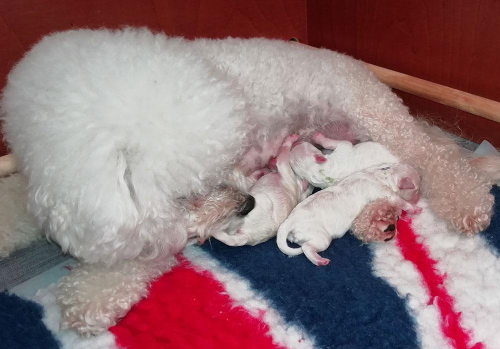 Een teef is gemiddeld 63 dagen drachtig. Ook hier zijn de meningen over verdeeld; wel of niet wassen. Sommigen doen nog een week voor de bevalling wassen en knippen. Zelf zou ik het wat eerder doen, aangezien de teef het de laatste week het zwaarst heeft. En dan zou ze ook nog zo’n trimbehandeling moeten doorstaan.