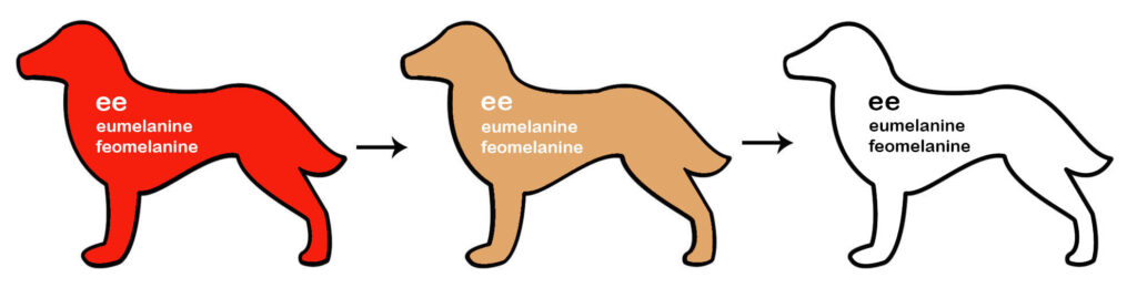 Er kunnen dus tinten ontstaan met alles tussen rood en wit; donker rood, licht rood, goud, creme, oranje, wit. In dit geval is wit niet echt helemaal wit. Eigenlijk is het een sterke verdunning van rood. Dit kun je zien aan de gele waas op sommige delen van de vacht.