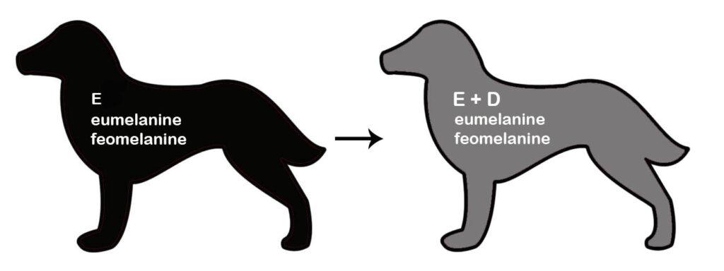 Het D-gen zorgt voor verdunning van de kleur. Zwart wordt bijvoorbeeld blauw of grijs.
