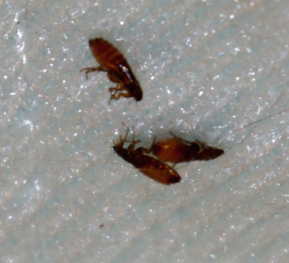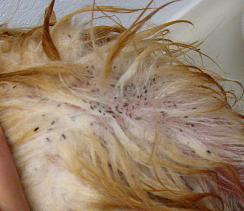 In de vacht bevinden zich zwarte vlooienpoepjes. Als je die nat maakt vloeit het rood-bruin uit. Vlooien zelf zijn heel beweeglijk en zie je duidelijk over de huid lopen.