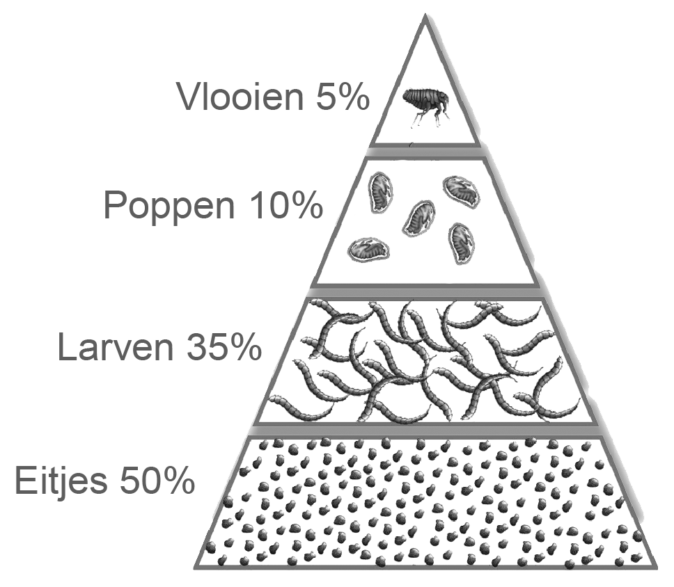 Een vlooienplaag bestaat niet alleen uit vlooien, maar ook uit poppen, larven en eitjes. Zie de pyramide hiernaast. Als een hond vlooien heeft, reken er dan maar op dat men het 10-dubbele aan eitjes in huis heeft. Eitjes kunnen onder gunstige omstandigheden wel een jaar overleven.
